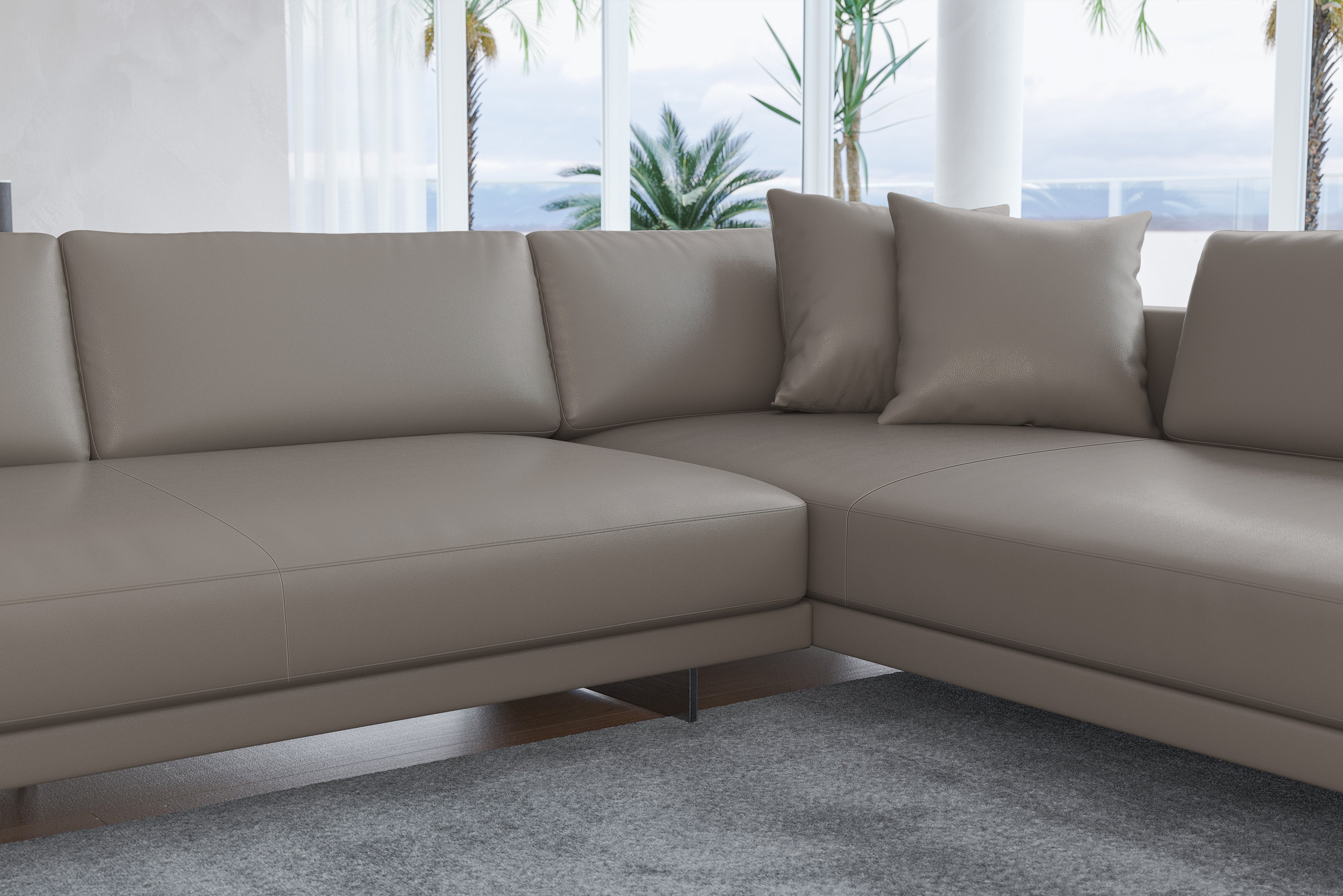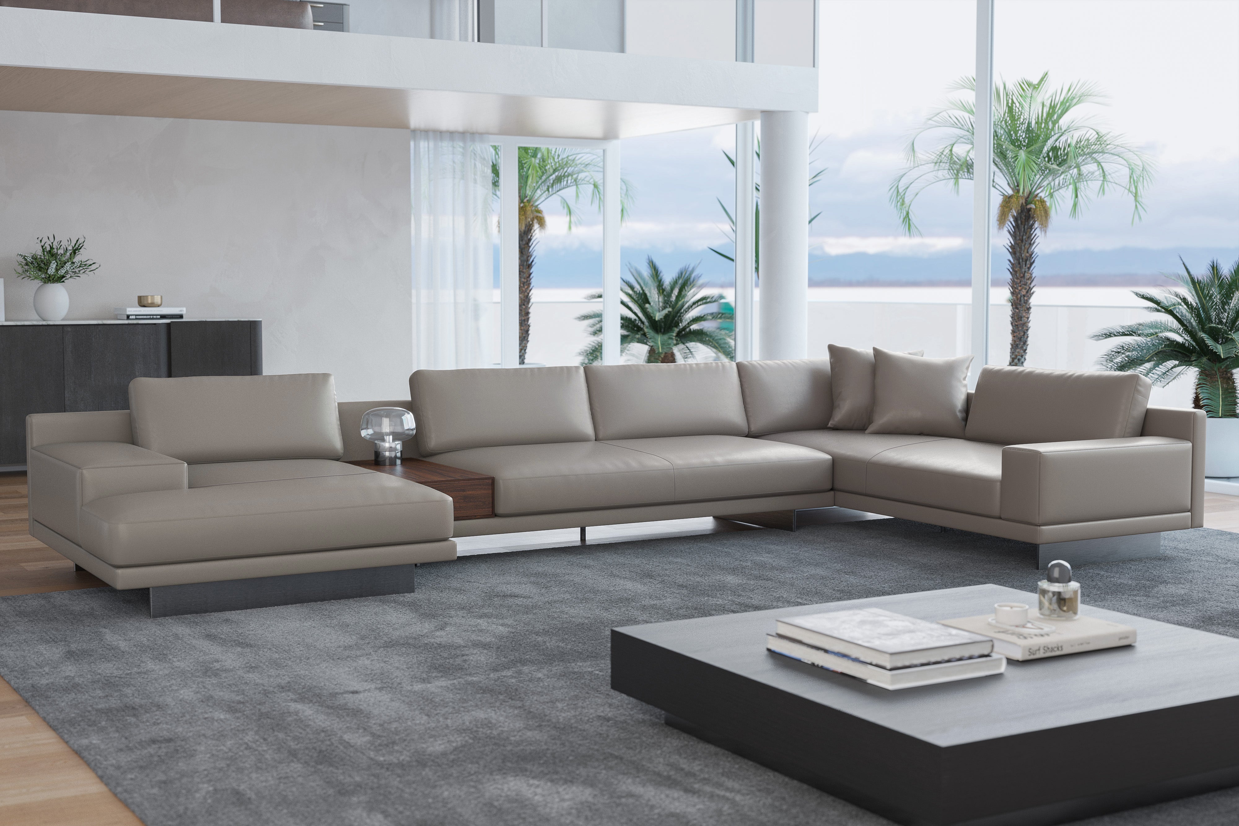 Transforma tu espacio con el Sofá Seccional Modular de Cuero Alessandro. Tapizado en cuero italiano Nappa 11000 de grano superior en todas las superficies de asiento, ofrece una apariencia y sensación sofisticada y de alta gama. Construido para durar, su estructura de madera maciza secada al horno con refuerzos en las esquinas y uniones clavadas garantiza durabilidad. El armazón acolchado con espuma de poliuretano y fibra de poliéster, combinado con cojines de espuma de alta densidad en 3 capas y rematados con plumas de ganso, asegura una comodidad insuperable. Las patas de acero inoxidable brindan soporte sólido, mientras que una mesa de almacenamiento con acabado en chapa de nogal y cajón de apertura por presión añade funcionalidad. Completado con dos cojines decorativos, el Alessandro representa el lujo en su máxima expresión.
