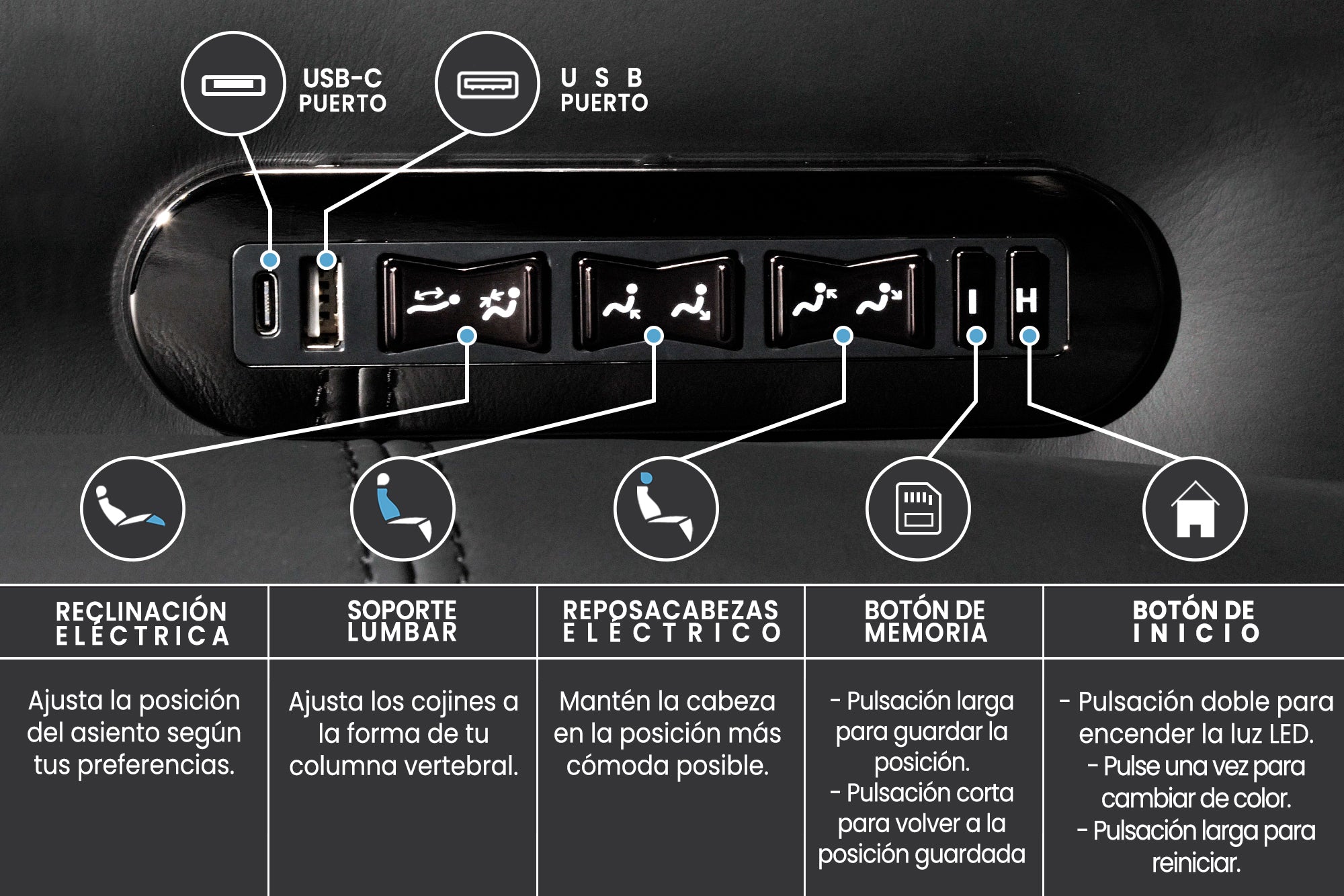 Navegue cómodamente gracias a los controles mecánicos situados en el interior del reposabrazos. El mando tiene un puerto USB-C y otro regular para que pueda cargar todos sus dispositivos mientras disfruta de la película. Está equipado con función de memoria para guardar cómodamente su preferencia de posición personal, así como el botón de inicio. |